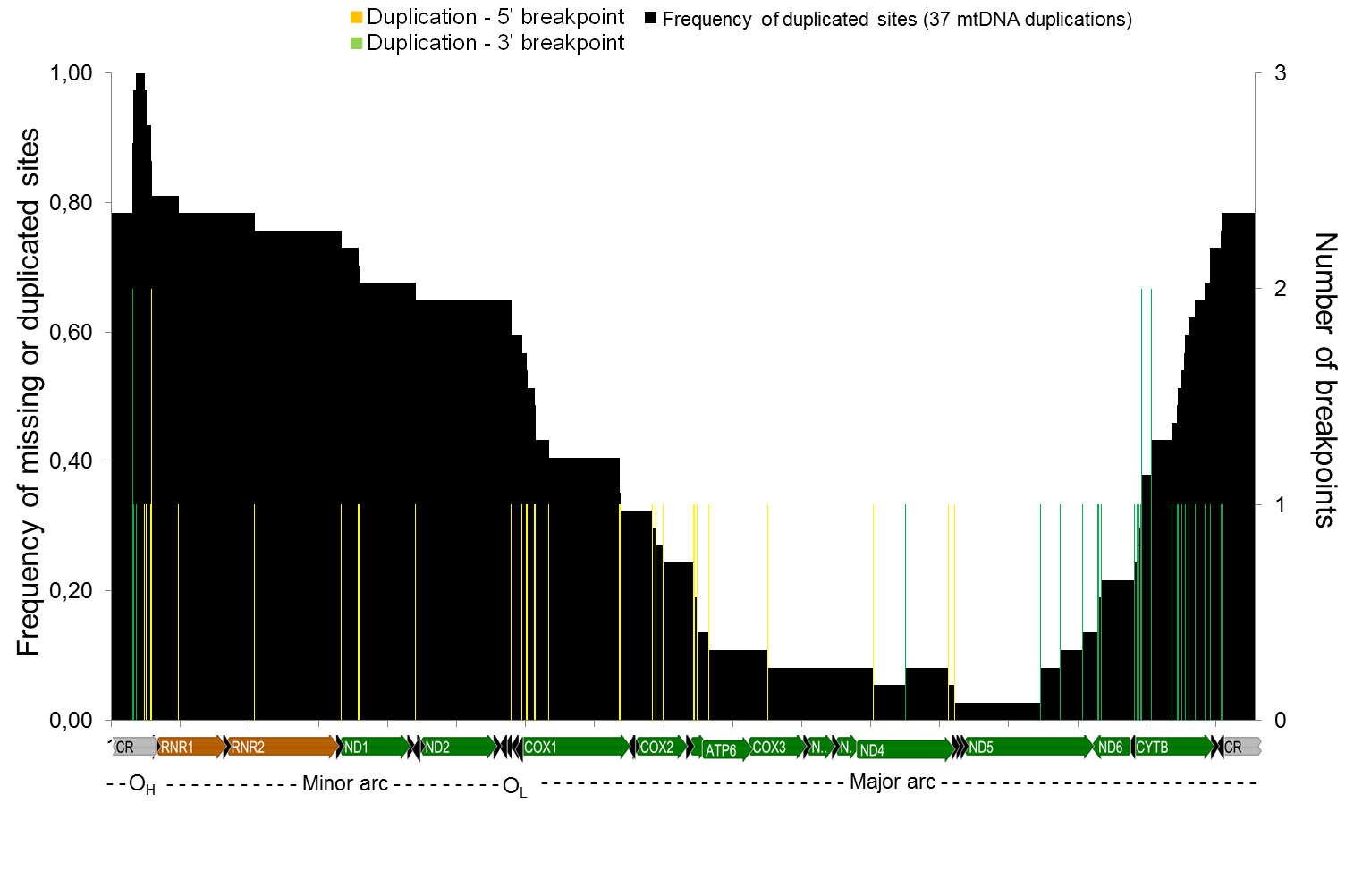 | mtDNA section (first position) | mtDNA section (last position) | Duplicated site (n) | Duplicated site (%) |